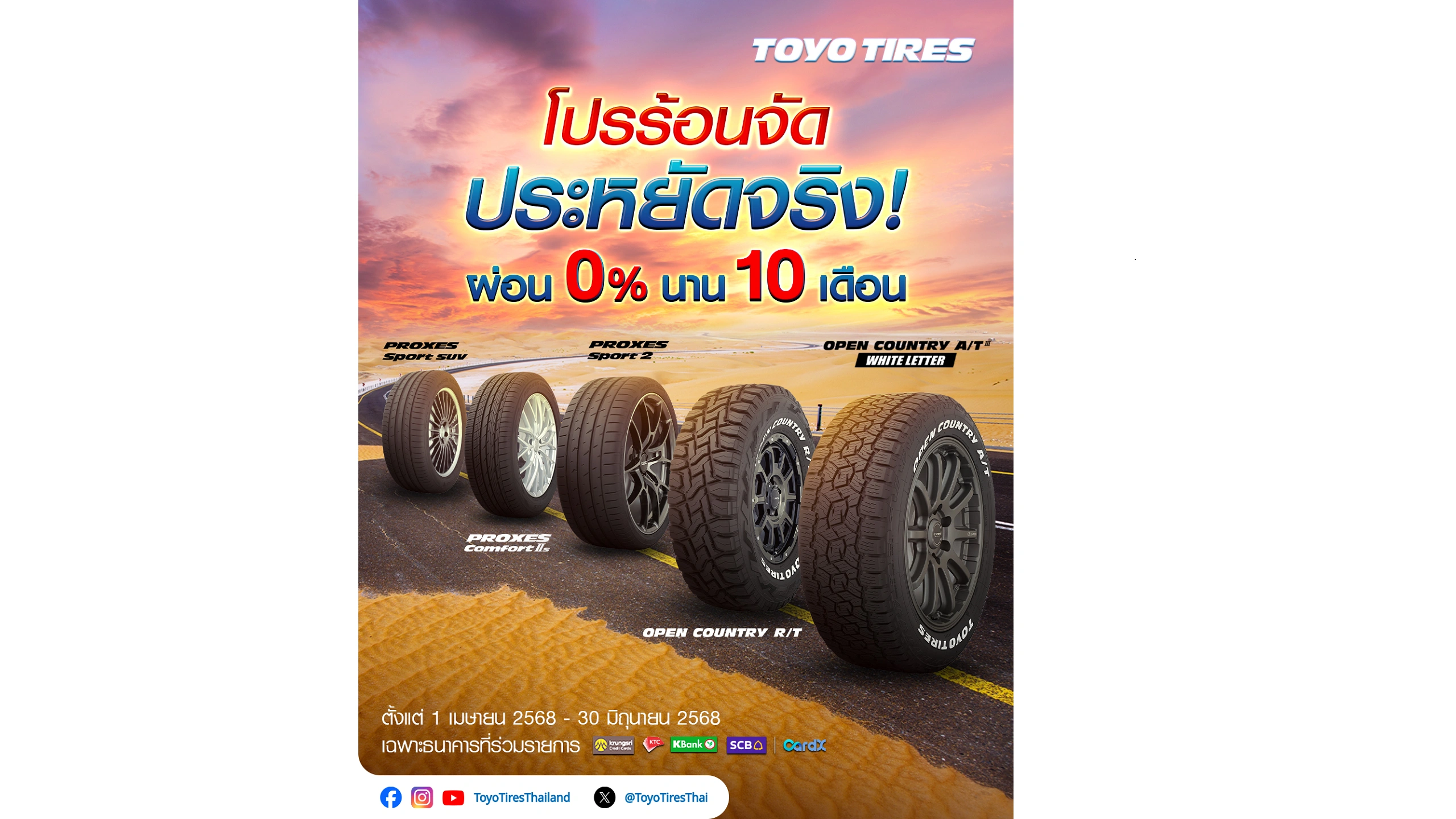 ยาง TOYO TIRES รุ่นยอดฮิต โปรผ่อน 0% นาน 10 เดือน เฉพาะยาง OPEN COUNTRY R/T, OPEN Country A/T 3 WHITE LETTER, PROXES SPORT 2, PROXES C2S และ PROXES SPORT SUV ✨ เมื่อชำระผ่านบัตรเครดิตธนาคารที่ร่วมรายการ ดังนี้